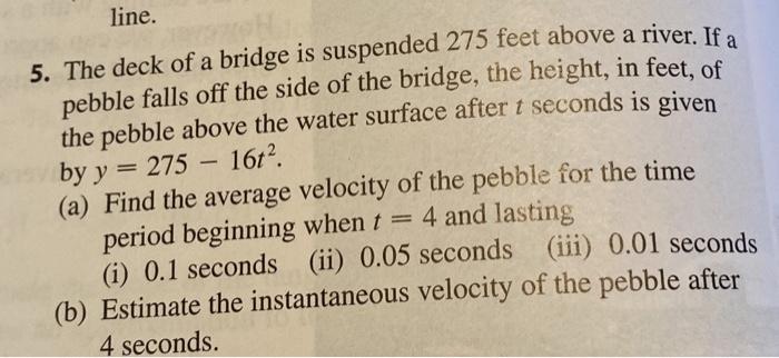 The deck of a bridge is suspended 275 feet above a river. If a pebble falls off the side of the bridge the height in feet of the pebble above the water surface after t seconds is given by y 275 - 16t 2. If a pebble falls off the side of the bridge the height in feet of the pebble above the water surface after t seconds is given by y 275 - 16t2a Find the average velocity of the pebble for the time period beginning when t 4 and lasting i 01 seconds ii 005 seconds iii 001.